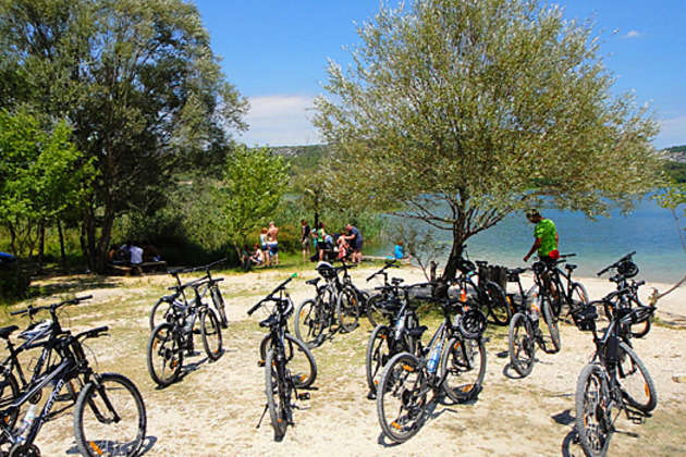 There is hardly a better way to get around the area of the National Park Krka River then cycling. This biking route will lead you thru Croatian history enjoying the landscape of forests and hills, monuments and bird reserves. Our first destination is the famous 44-meters high Skradinski Buk waterfall. The fantastic karst formations and travertine waterfalls make it a beautiful swimming area. After a short sightseeing tour we will bike to the shores of Visovac Lake. You can take and optional boat trip to the Visovac Island and Franciscan monastery. After sightseeing the monastery and museum the boat will take you back to the shore to continue our biking tour. Before finishing our cycling day we will make a short swimming break on the beautiful beach on the upper part of the National park Krka River. Continuing back to Skradin we have a magnificent ride downhill with a scenic view over the Prokljan Lake and town Skradin.
