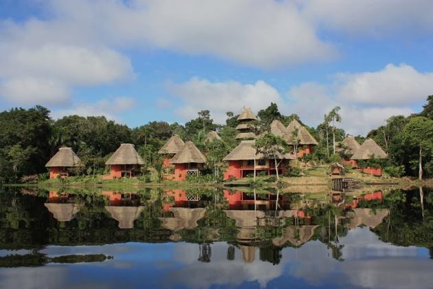 onto a comfortable covered motor boat. Here we start a boat ride along the Napo for approximately 2 hours. Some aquatic birds can be spotted on the way. After arriving at Napo Wildlife Center’s welcoming area, we take a magical and peaceful 2 hour dugout-canoe along a narrow creek that connects to the lake where the lodge is located. Great chances to spot wildlife, various species of