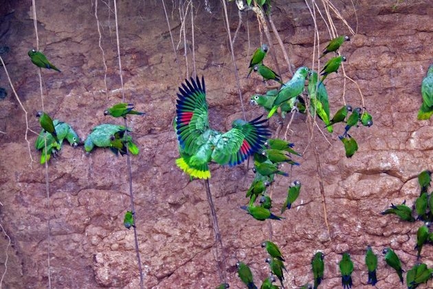 This morning we visit the best parrot clay licks in Ecuador!!! Early start and paddle downstream on the Añangu creek as far as the welcome area. Then, take the motor boat for a 10 minute ride for a wonderful view of thousands of parrots such as Amazon-Mealy, blue-headed, orange –cheek, among others, landing on the earth to eat the clay. Later, back to the welcome area and a short hike to the parakeets’ clay lick, where hundreds of cobalt-winged parakeets remain on the top of the trees searching for the best time to eat the salts, chemicals and minerals contained in the organic matter. Lunch in the welcome area. In the afternoon, visit the interpretation area to see the traditions of the