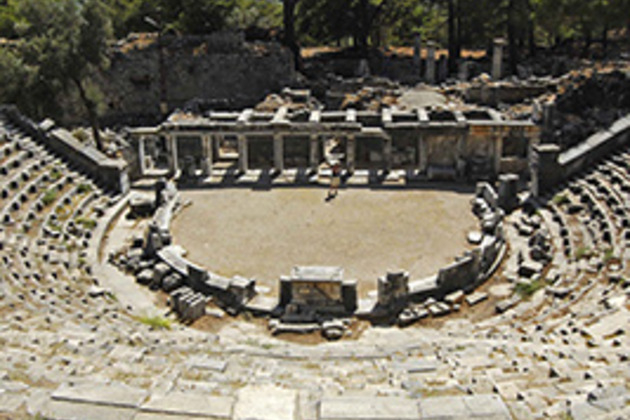 Priene's ruins include several columns of the Temple of Athena, much of the city wall, a well-preserved theatre and a council chamber. The ruins are next to the modern town of Güllübahce. Priene was discovered by the inhabitants on the Ionian coast. The Ionians first arrived and settled here in the 11th century BC and the city was founded either by Aegyptus of Athens, Philotas of Thebes or Amazon queens.