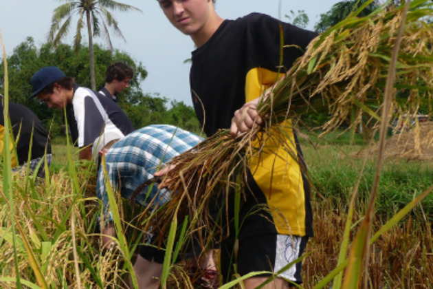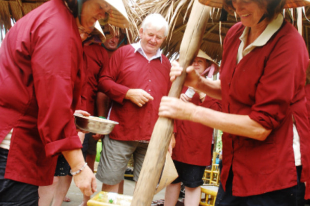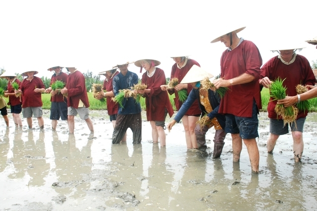 Meet guests at hotel by bicycle (minivan used as an option if unable to ride a bike). Bike to the countryside crossing though rice paddies and enjoy the fresh air. Meet the local farmers, discuss about the daily life of local farming, and enjoy a cup of tea with the farmers in the middle of the rice paddy field. Wear farming clothes before getting into the muddy rice field. Tour guide will provide introduction and explanation about the process of the rice and how to grow it in wet field. Take part in farming works to learn how to grow rice with water buffalo plough and use agricultural water system. Transplant baby wet rice at the rice paddy field. Enjoy riding the water buffalo in a small pond at a rice farm. Have a local meal with the local farmer in their home. Bike back to the hotel.
